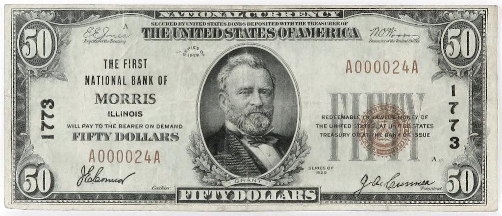 1929 $50 National Currency Note - The First National Bank of Morris, Illinois. Low Serial # A000024A. CH# 1773 FR# 1803-1.