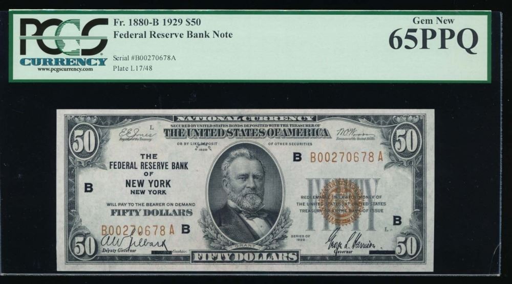 One 1929 $50 New York Federal Reserve Bank Note PCGS 65PPQ.