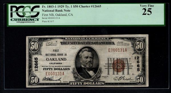 One 1929 $50 Oakland National Bank Note PCGS 25.