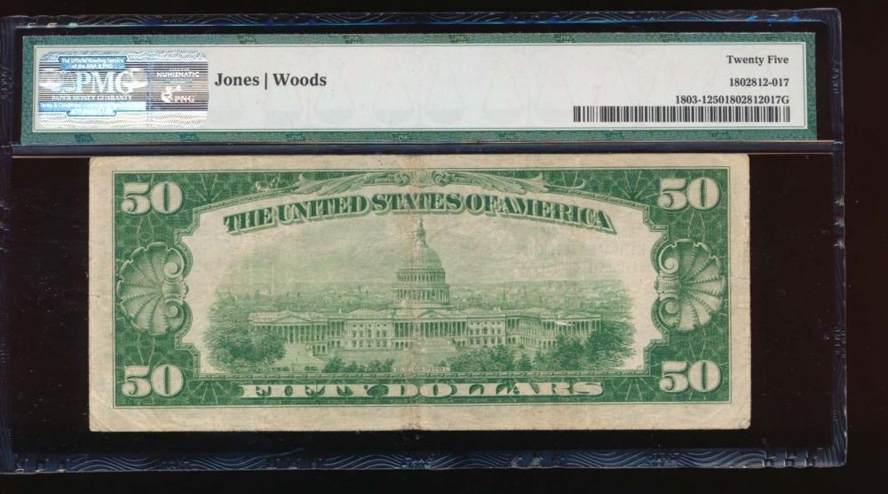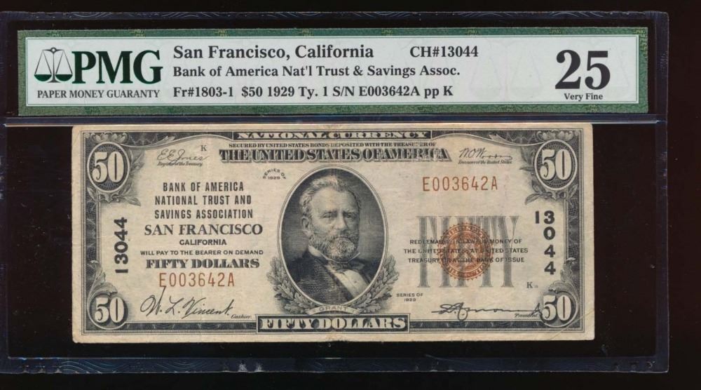 One 1929 $50 San Francisco National Bank Note PMG 25.