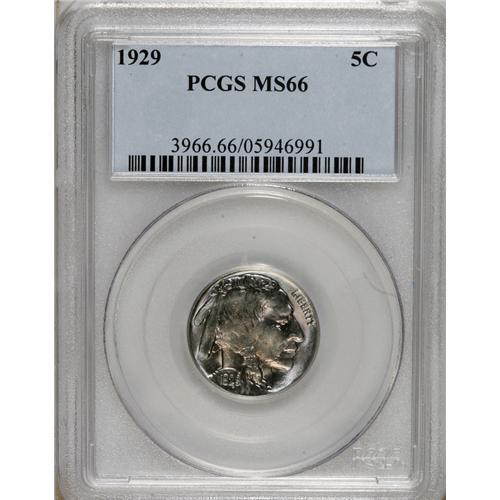 <B>1929 5C MS66 PCGS.</B></I> A flashy coin, pink in the centers with sky-blue at the margins, that has extraordinarily clean surfaces. While the braid and the bison's shoulder display softness, the head and horn are bold. A great coin from the transition year that saw the Roaring Twenties give way to the Great Depression. PCGS has graded only three coins finer (4/07).<BR><BR><b>Shipping:</b> Coins & Currency (<a target="_blank" href="http://www.heritageauctions.com/common/shipping.php">view shipping information</a>)