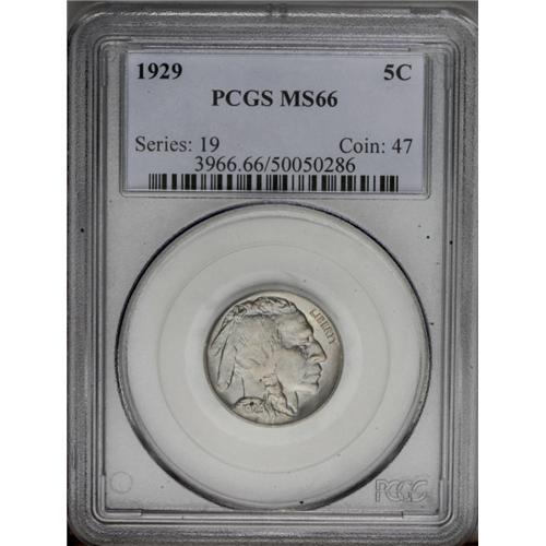 <B>1929<5C> MS66 PCGS.</B></I> Well struck except above the knot in the Indian's hair braid, with flashy full luster and pleasing steel-gray-blue toning. Nearly pristine, and a lovely Premium Gem. Population: 99 in 66, 1 finer (3/06).<BR><I>From The Alex & Nan Registry Sets.</B></I> <BR><BR><B>Important notice:</B> Heritage usually auctions material at the rate of 200-250 lots per hour. On some occasions eBay Live bid software or the Internet may not be able to keep up with the pace of the auction. We recommend placing a realistic absentee bid now as insurance to avoid disappointment. Occasionally the auctioneer may eliminate or reject an eBay Live bid, and the auctioneer may also reopen a lot after the close of the eBay live bidding (usually because we missed an audience bid), and may reject your bid even if it shows you as the winning bidder. By bidding via eBay Live, you agree that Heritage may award the lot to another bidder at its sole discretion under the circumstances described above or any other reasonable circumstances. Since eBay bids are not shown to us until we open the lot on the floor, we treat those bids just like floor bids. In most cases the floor responds before the eBay bid is presented to us, due to Internet lag time, so for consistency we have made it a policy that floor bids are always considered first over tie eBay live bids. Also please note that all Heritage lots purchased through eBay Live carry a 20% Buyer's Premium. Please make sure you read the Terms and Conditions before you bid. This lot is being auctioned in conjunction with a live floor auction by Heritage Galleries & Auctioneers. All final auction and invoice information will be supplied by Heritage Galleries & Auctioneers, and all other information should be considered preliminary. Lot:1106 <BR><BR><B>Winning Notification and Billing:</B> After the FINAL session in this auction is complete, Heritage will send e-mail and snail mail invoices. This process normally takes several days. All final auction and invoice information will be supplied by Heritage Galleries & Auctioneers, and all other information should be considered preliminary. <BR><BR>This auction will be conducted on a live auction floor and over the Internet through eBay Live. If you choose to place an absentee bid, please take a moment to <font color='#0000ff'><u><a href='http://pages.ebay.com/liveauctions/help/before/laabsentee.html'>learn how eBay Live absentee bidding works</a></u></font><font color='#000000'>