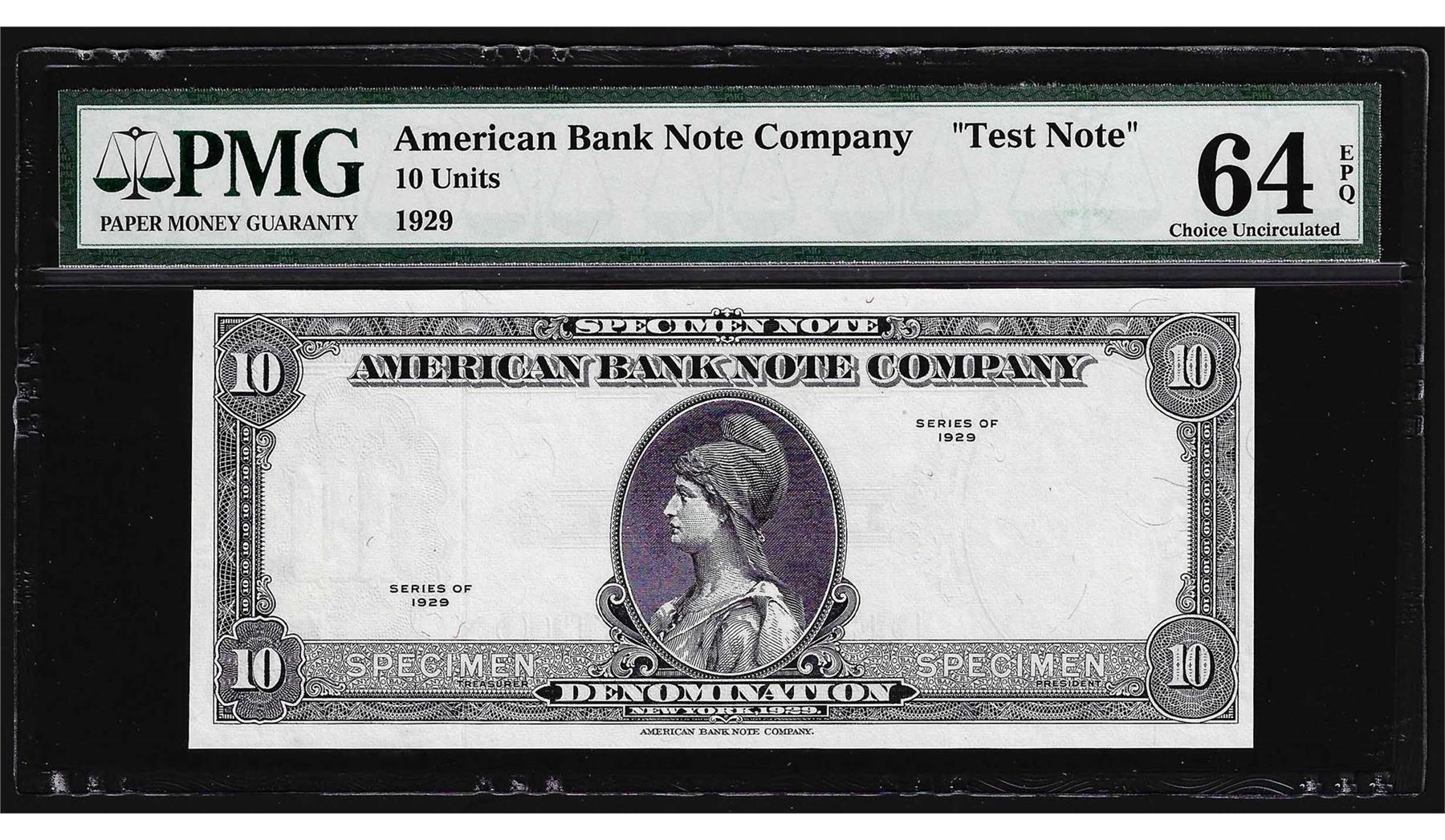 One 1929 American Bank Note Company Test Note 10 Units PMG 64EPQ. PMG Certified.
