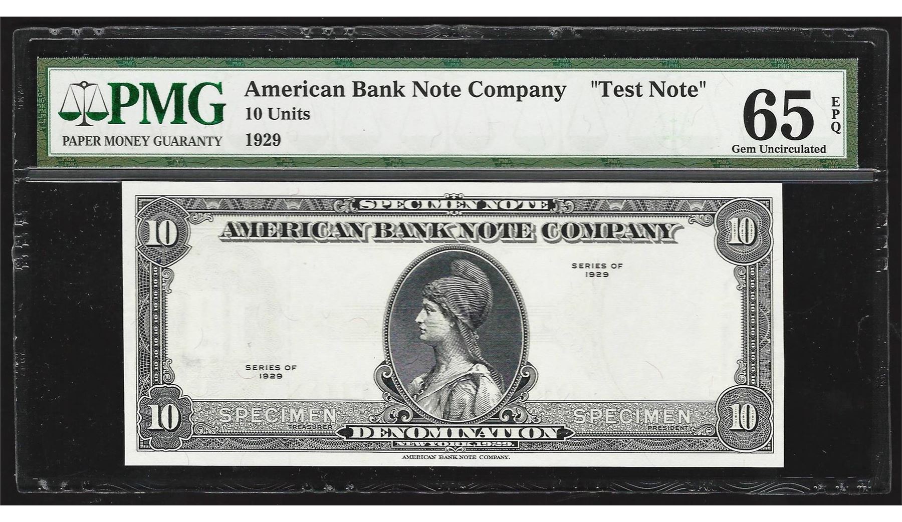 One 1929 American Bank Note Company Test Note 10 Units PMG 65EPQ. PMG Certified.