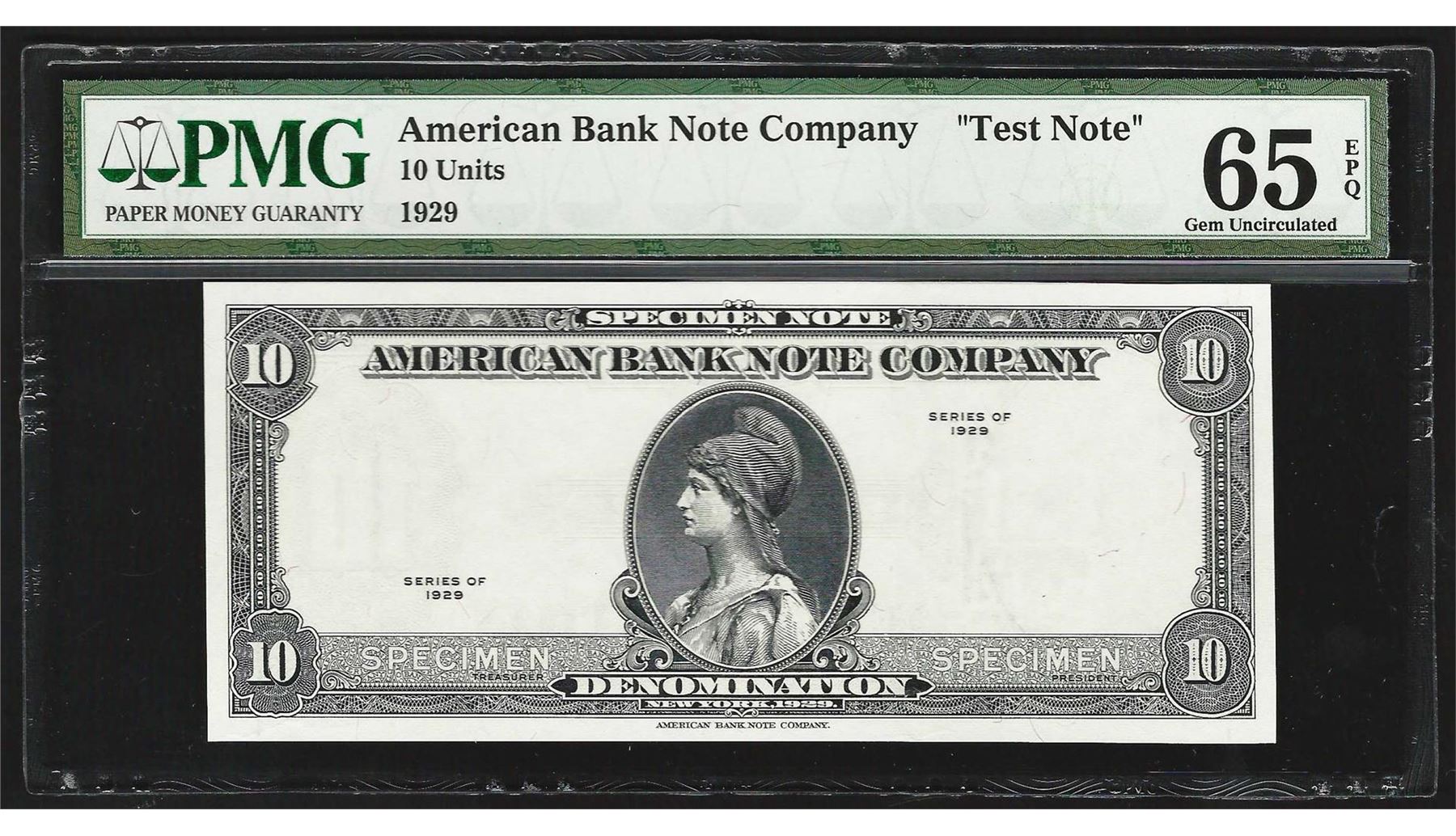 One 1929 American Bank Note Company Test Note 10 Units PMG 65EPQ. PMG Certified.