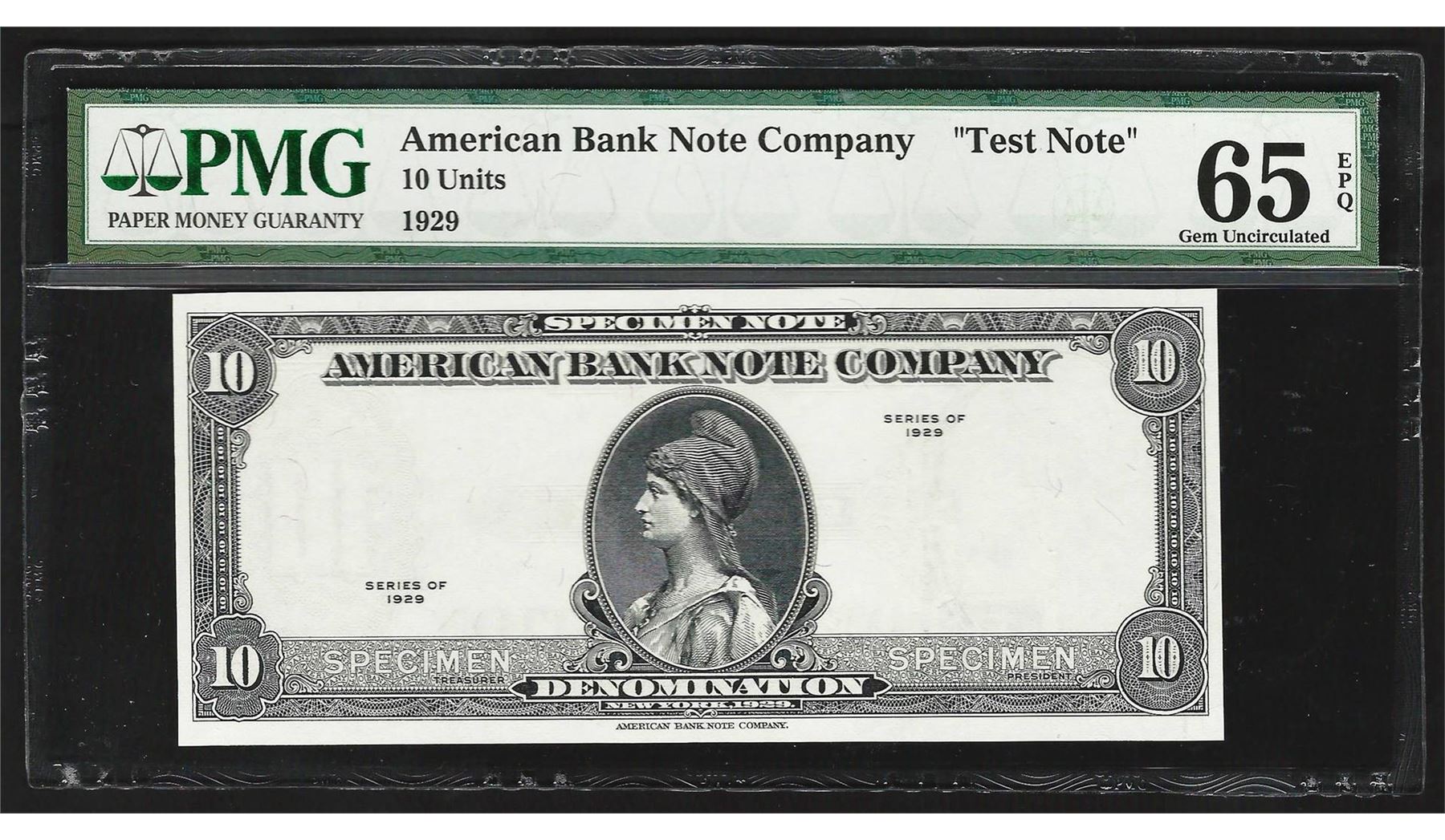 One 1929 American Bank Note Company Test Note 10 Units PMG 65EPQ. PMG Certified.