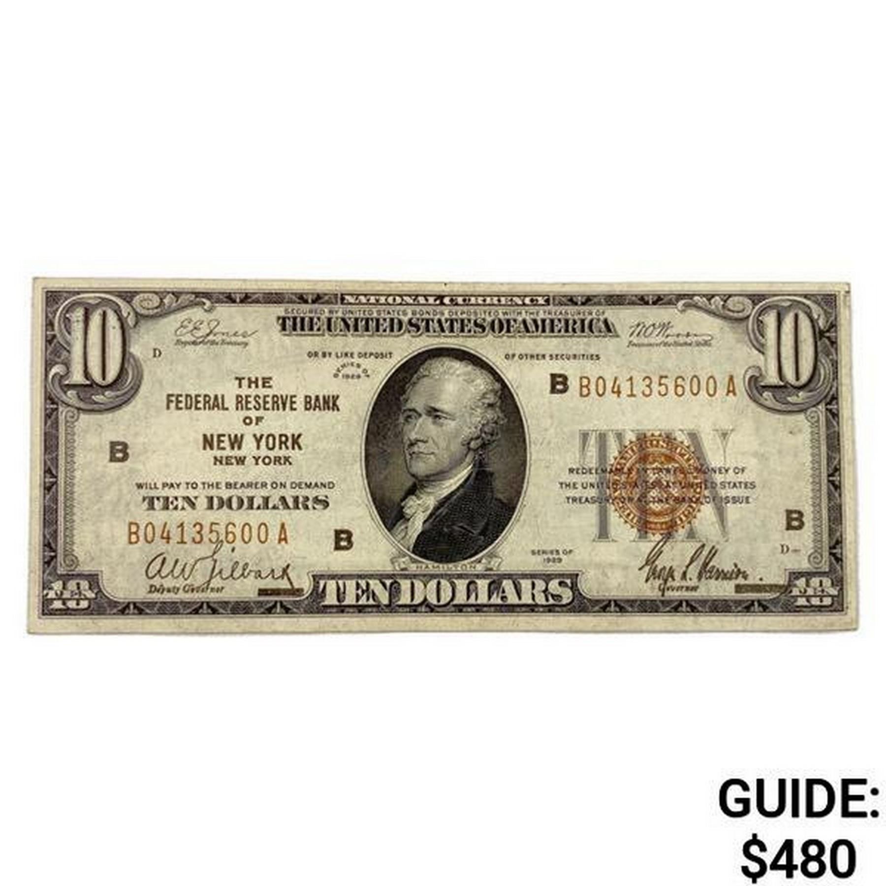 1929 B $10 US Bank of New York Fed Res Note