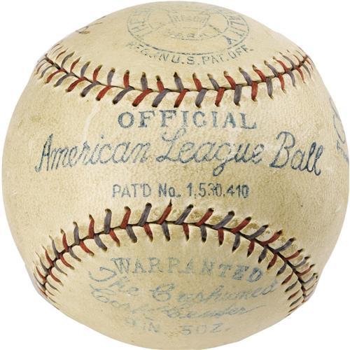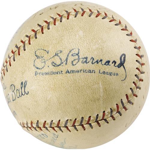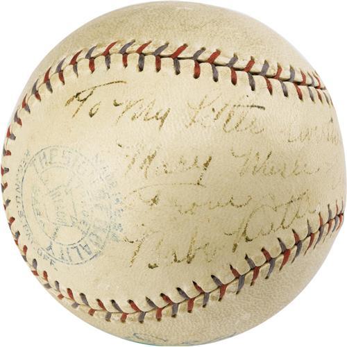 <B>1929 Babe Ruth Single Signed Baseball.</B></I> A gorgeous OAL (Barnard) ball with contrast stitching and bold stamping holds a charming inscription from the game's greatest star. The Babe fills an entire side panel and sweet spot with the handwritten text, "To My Little Sweetheart Mary Mires, From Babe Ruth, April 6, 1929." The boldness of the ink averages 5/10, dropping below this mark only at far right with Ruth's handwritten date. The all-important autograph, and the "My Little Sweetheart" inscription, are easily legible and display very nicely. A special ball that demonstrates the sweet natured Babe's affection for children that is well documented in baseball lore. <I>LOA from PSA/DNA. LOA from James Spence Authentication.</B></I><BR><BR><b>Shipping:</b> Balls, Pucks, etc., Small (<a target="_blank" href="http://www.heritageauctions.com/common/shipping.php">view shipping information</a>)