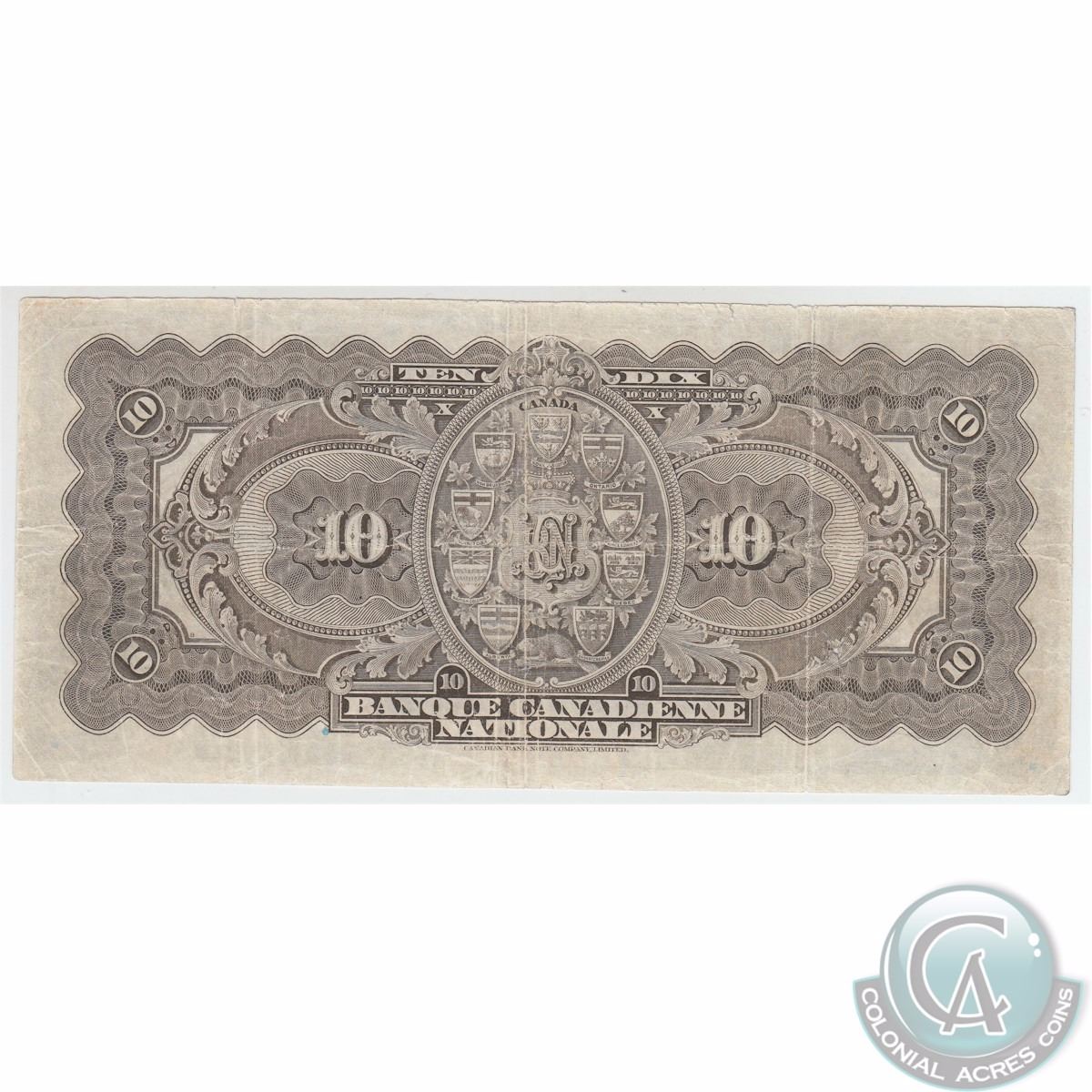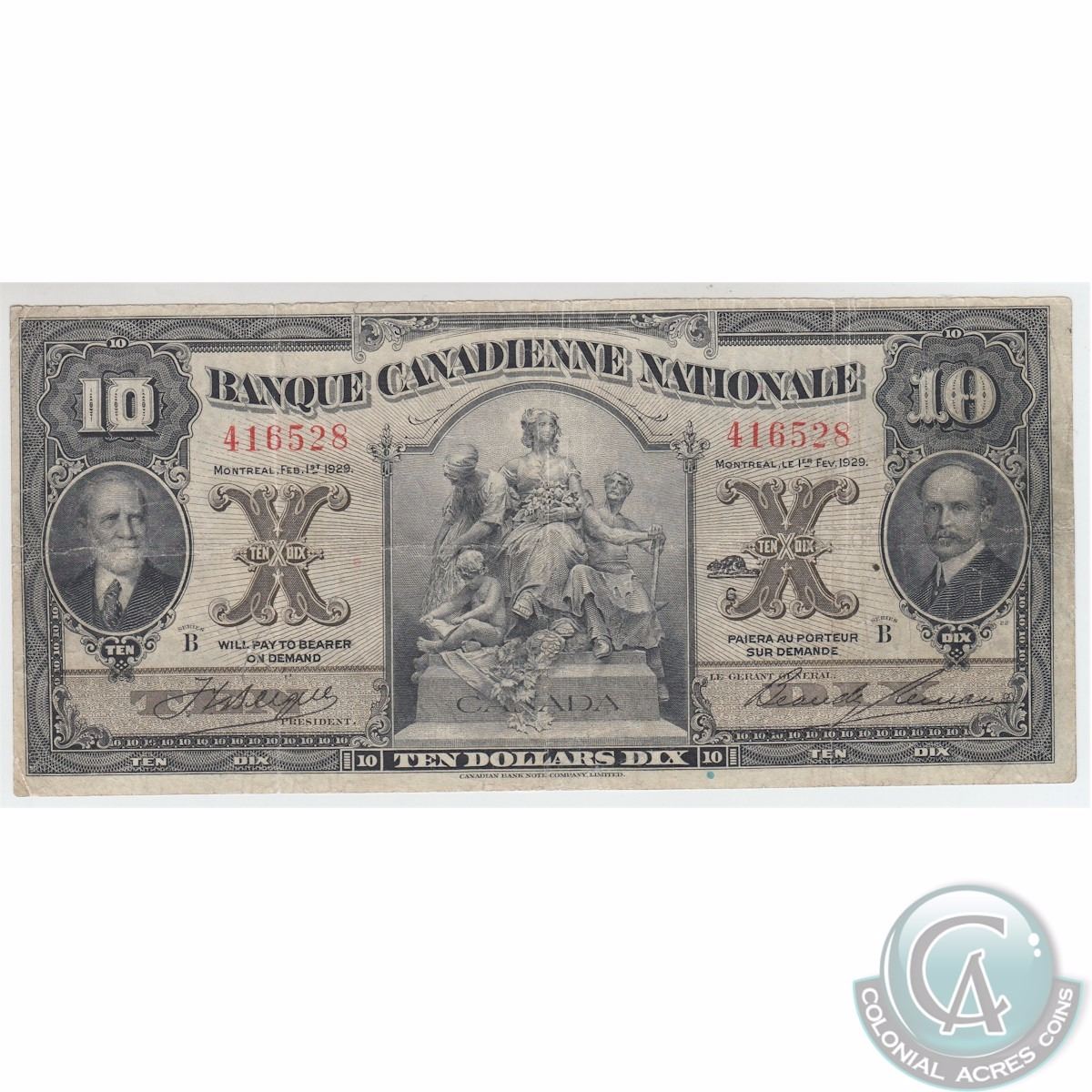 1929 Banque Canadienne Nationale $10. 85-12-04, S/N: 416528 in F-VF Condition. The note has a few minor tears.
