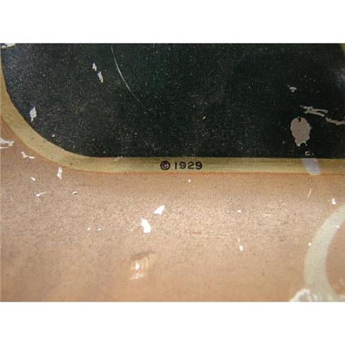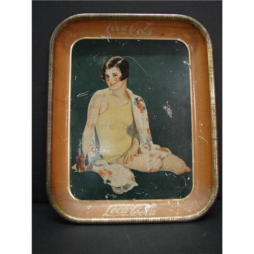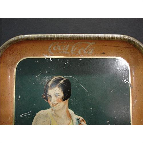 1929 TIN COCA-COLA TRAY. Decorated with a seated female holding a Coca-Cola bottle. Shows scratch marks with some loss to design. 13.25” x 10.5”