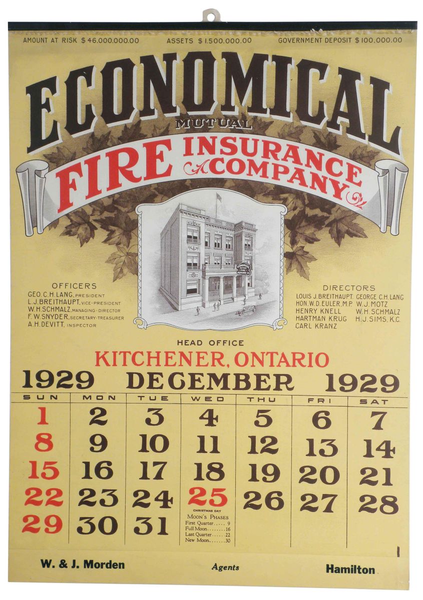 1929 Calendar for the Economical Fire Insurance, Kitchener, Ont. W & J Morden, Agent, Hamilton, Ont. December page only, original band on top, excellent condition. 12 X 16 1/2 inches. Start Price $50