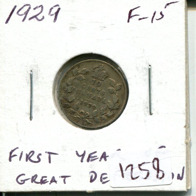 1929 Canadian Silver 10 Cents. First year of the Great Depression. F-15.