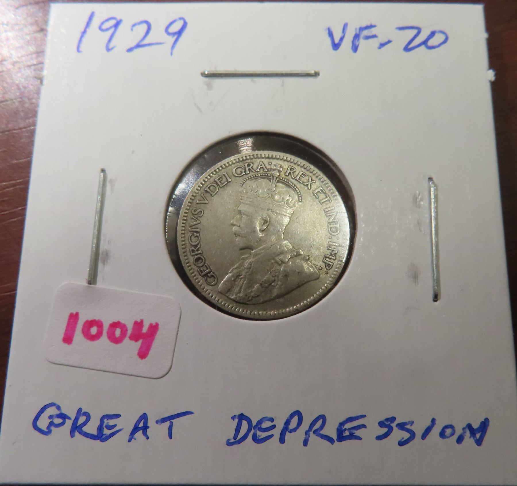 1929 Canadian Silver 10 Cents. First year of the Great Depression. VF-20.