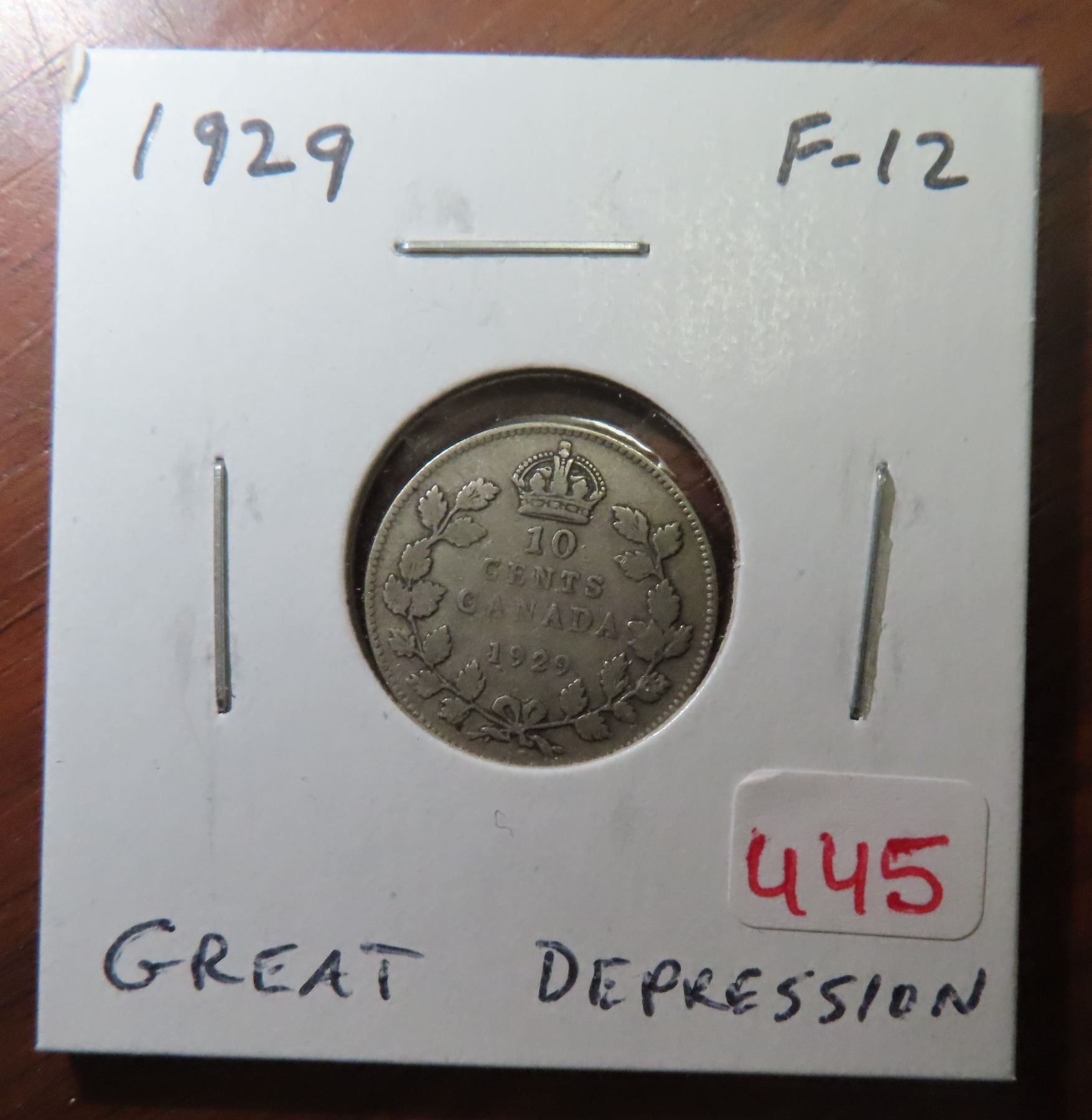 1929 Canadian Silver 10 Cents. Issued during the first year of the Great Depression. F-12.