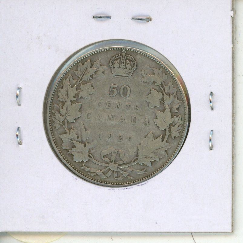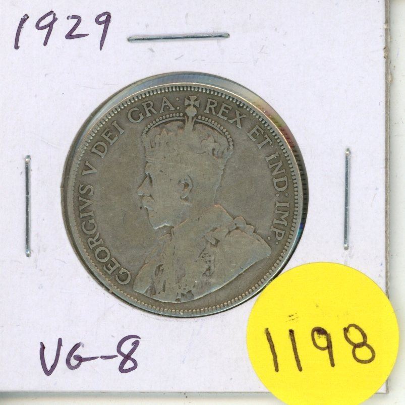 1929 Canadian Silver 50 Cents. Issued during the first year of the Great Depression. VG-8.
