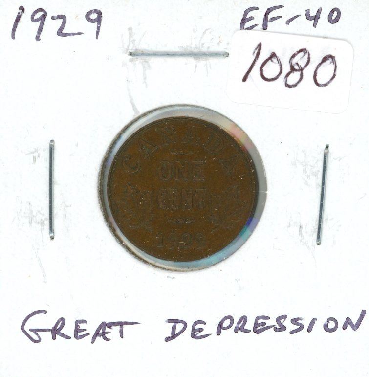 1929 Canadian Small Cent. First year of the Great Depression. EF-40. Nice.
