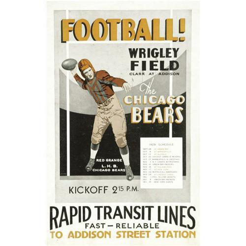 <B>1929 Chicago Bears Schedule Broadside with Red Grange.</B></I> Before the appearance on the scene of the game's biggest star, professional football was given about the same respect as was the recent X.F.L. College football was the only football that mattered, so it is certainly not overstating the matter to claim that the University of Illinois star single-handedly brought legitimacy to the National Football League. Joining Babe Ruth, Bobby Jones and Bill Tilden as the Golden Age representative of his respective sport, Grange was the only obvious choice to be featured on promotional materials for pieces such as this marvelous broadside that encourages fans to attend Bears games at Chicago's Wrigley Field. The powerful image of the Galloping Ghost is framed by bold art deco text, creating one of the most aesthetically beautiful broadsides to reach the auction block in recent memory. Condition is remarkable for an artifact of this vintage, with the small supply of light creasing restricted all but entirely to the white areas of the piece and doing nothing to detract from the tremendous eye appeal. The heavy card stock broadside is 14x21" in size, but its importance is simply immeasurable. <BR><BR><B>Important notice:</B> Heritage usually auctions material at the rate of 200-250 lots per hour. On some occasions eBay Live bid software or the Internet may not be able to keep up with the pace of the auction. We recommend placing a realistic absentee bid now as insurance to avoid disappointment. Occasionally the auctioneer may eliminate or reject an eBay Live bid, and the auctioneer may also reopen a lot after the close of the eBay live bidding (usually because we missed an audience bid), and may reject your bid even if it shows you as the winning bidder. By bidding via eBay Live, you agree that Heritage may award the lot to another bidder at its sole discretion under the circumstances described above or any other reasonable circumstances. Since eBay bids are not shown to us until we open the lot on the floor, we treat those bids just like floor bids. In most cases the floor responds before the eBay bid is presented to us, due to Internet lag time, so for consistency we have made it a policy that floor bids are always considered first over tie eBay live bids. Also please note that all Heritage lots purchased through eBay Live carry a 22.5% Buyer's Premium. Please make sure you read the Terms and Conditions before you bid. This lot is being auctioned in conjunction with a live floor auction by Heritage Galleries & Auctioneers. All final auction and invoice information will be supplied by Heritage Galleries & Auctioneers, and all other information should be considered preliminary. Lot:19244 <BR><BR><B>Winning Notification and Billing:</B> After the FINAL session in this auction is complete, Heritage will send e-mail and snail mail invoices. This process normally takes several days. All final auction and invoice information will be supplied by Heritage Galleries & Auctioneers, and all other information should be considered preliminary. <BR><BR>This auction will be conducted on a live auction floor and over the Internet through eBay Live. If you choose to place an absentee bid, please take a moment to <font color='#0000ff'><u><a href='http://pages.ebay.com/liveauctions/help/before/laabsentee.html'>learn how eBay Live absentee bidding works</a></u></font><font color='#000000'>