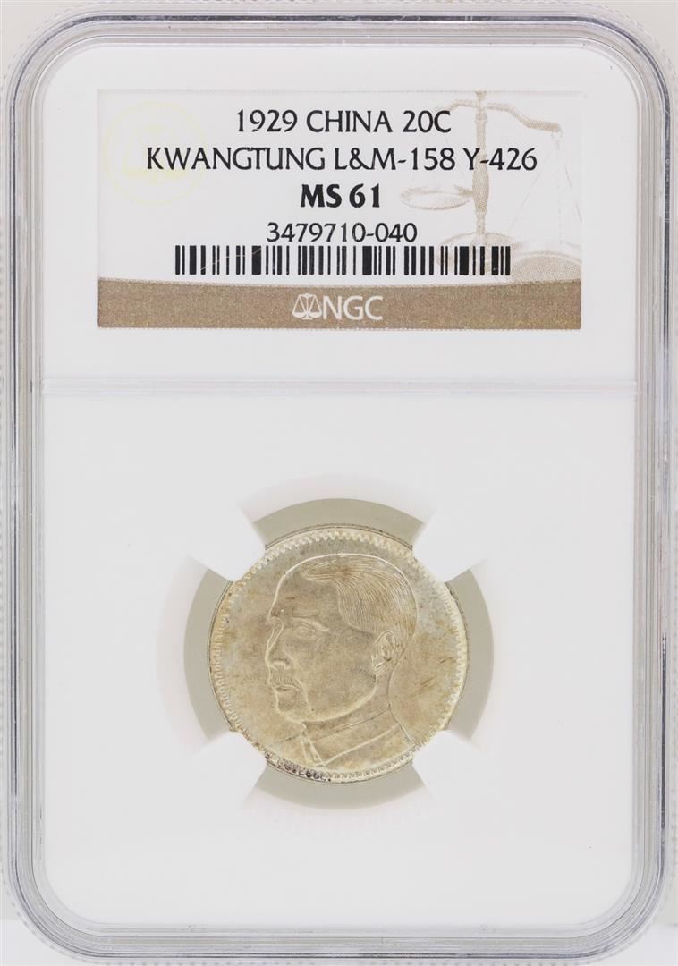 One 1929 China 20 Cent Kwangtung Coin NGC MS61. NGC Certified.