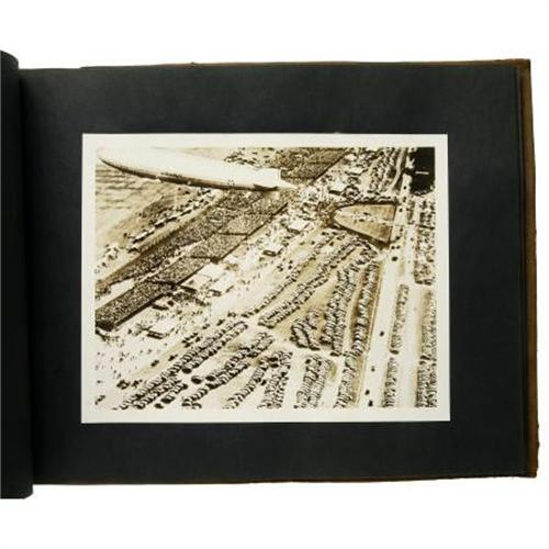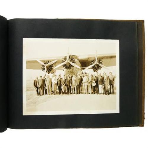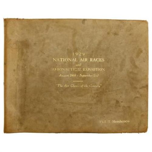 <B>1929 Cleveland National Air Races Album,</B></I> oblong folio with brown suede covers personalized in gold foil for Phil T. Henderson (brother of Cliff Henderson), contains 27 vintage 8” x 10” photographs of the event, a label in the back of the album credits the images to the Heiser Co. of Cleveland, Ohio. Subjects included are planes airborne and grounded, Charles and Anne Lindbergh with Henderson, ceremonies, the trophies, and a remarkable aerial view of the exposition in which the full parking lot demonstrates the show's magnitude. Aging with stains to cover, very fine condition. <I>From the collection of Cliff Henderson.</B></I><BR><BR><b>Shipping:</b> Books & Catalogs (<a target="_blank" href="http://www.heritageauctions.com/common/shipping.php">view shipping information</a>)