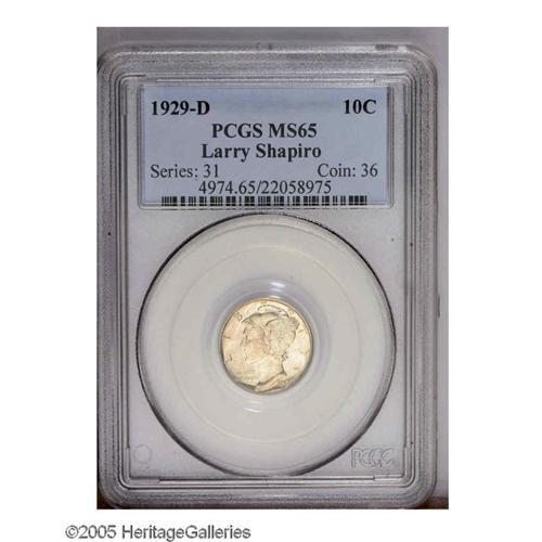 <B>1929-D<10C> MS65 PCGS.</B></I> Rich luster glistens over essentially brilliant surfaces, but not quite fully struck, especially at selected peripheral areas.<BR><I>From The Larry Shapiro Collection of Mercury Dimes.</B></I>