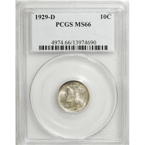 <B>1929-D 10C MS66 PCGS.</B></I> PCGS Population (21/7). NGC Census: (61/10). Mintage: 5,034,000. Numismedia Wsl. Price for NGC/PCGS coin in MS66: $125. (#4974)<BR><BR><B>Coin Engraver:</B> Adolph A. Weinman<BR><BR><b>Shipping:</b> Coins & Currency (<a target="_blank" href="http://www.heritageauctions.com/common/shipping.php">view shipping information</a>)