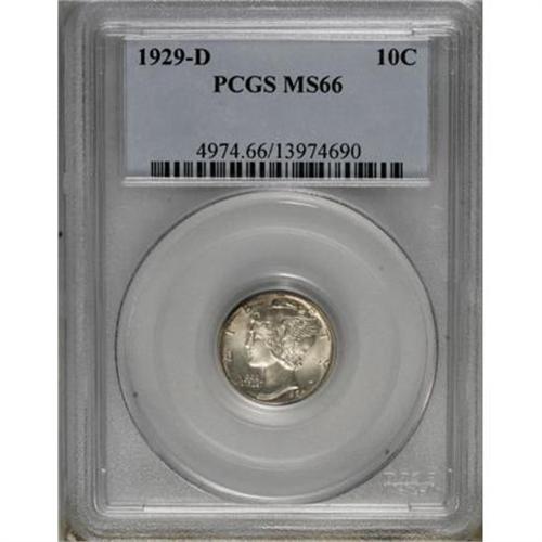 <B>1929-D 10C MS66 PCGS.</B></I> PCGS Population (21/7). NGC Census: (61/10). Mintage: 5,034,000. Numismedia Wsl. Price for NGC/PCGS coin in MS66: $125. (#4974)<BR><BR><B>Coin Engraver:</B> Adolph A. Weinman<BR><BR><b>Shipping:</b> Coins & Currency (<a target="_blank" href="http://www.heritageauctions.com/common/shipping.php">view shipping information</a>)