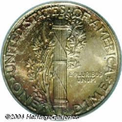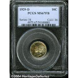 <B>1929-D<10C> MS67 Full Bands PCGS.</B></I> The surfaces and strike of this Mercury dime are all that one could hope for, as the well preserved surfaces display few noticeable marks and the strike is razor sharp, particularly so at the all-important reverse fasces bands. Iridescent splashes of violet, olive, and rose toning enhance the beauty of this shimmering Superb Gem example. Population: 20 in 67, 1 finer (9/04). <BR><BR><B>Important notice:</B> Heritage usually auctions material at the rate of 200-250 lots per hour. On some occasions eBay Live bid software or the Internet may not be able to keep up with the pace of the auction. We recommend placing a realistic absentee bid now as insurance to avoid disappointment. Occasionally the auctioneer may eliminate or reject an eBay Live bid, and the auctioneer may also reopen a lot after the close of the eBay live bidding (usually because we missed an audience bid), and may reject your bid even if it shows you as the winning bidder. By bidding via eBay Live, you agree that Heritage may award the lot to another bidder at its sole discretion under the circumstances described above or any other reasonable circumstances. Since eBay bids are not shown to us until we open the lot on the floor, we treat those bids just like floor bids. In most cases the floor responds before the eBay bid is presented to us, due to Internet lag time, so for consistency we have made it a policy that floor bids are always considered first over tie eBay live bids. Also please note that all Heritage lots purchased through eBay Live carry a 20% Buyer's Premium. Please make sure you read the Terms and Conditions before you bid.