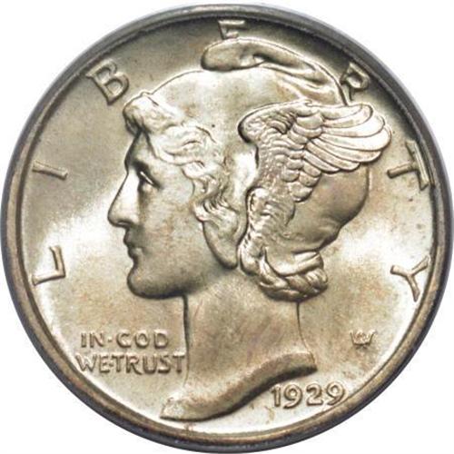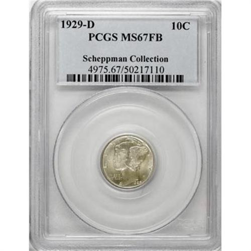 <B>1929-D 10C MS67 Full Bands PCGS.</B></I> Between the bold line separating the fasces, the powerful luster, and the impressive preservation, this 1929-D dime seems has everything in its favor. Whispers of gold and peach patina that grace the fields add a delightful finishing touch to a particularly impressive piece. PCGS has graded just one finer Full Bands coin (12/07).<BR><I>From The Scheppman Collection, #4 PCGS Registry of Full Band Mercury Dimes.</B></I><BR><BR><B>Coin Engraver:</B> Adolph A. Weinman<BR><BR><b>Shipping:</b> Coins & Currency (<a target="_blank" href="http://www.heritageauctions.com/common/shipping.php">view shipping information</a>)