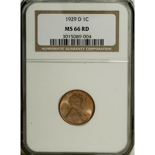 <B>1929-D 1C MS66 Red NGC.</B></I> As with many mintmarked Lincoln cents from the 1920s, a high mintage (in this case more than 41 million pieces) does not equate to availability in high grades. The 1929-D is an elusive issue in Gem and better condition. MS66 is the finest one can hope for--NGC has only certified one other, PCGS has graded 19--none are finer at either service (4/07). The surfaces on this piece are bright with even mint red color and perfectly balanced on both obverse and reverse. Highpoint definition is a bit soft, as always on the 1929-D.<BR><BR><b>Shipping:</b> Coins & Currency (<a target="_blank" href="http://www.heritageauctions.com/common/shipping.php">view shipping information</a>)