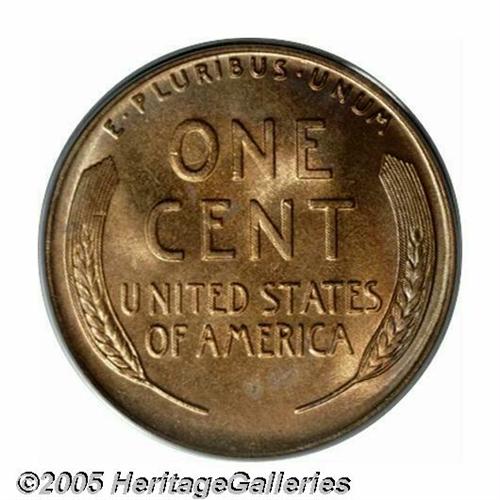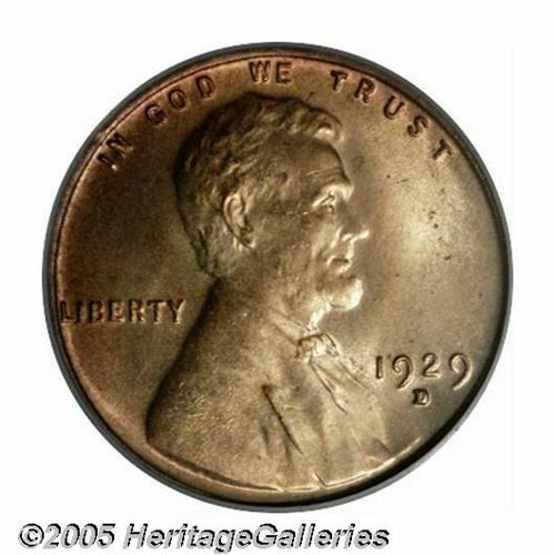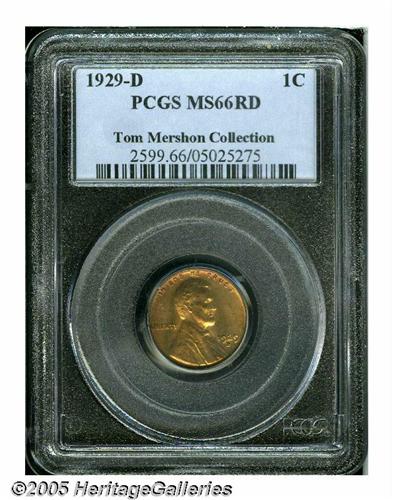 <B>1929-D<1C> MS66 Red PCGS.</B></I> This beautiful D-mint representative is tinged in reddish-orange and pale blue shades that confirm the fully lustrous designation. Virtually unmarked, each side shows evidence of being struck with moderately worn dies, a characteristic of this issue. A smooth, high end Gem. Population: 17 in 66, none finer at either service (3/05).<BR><I>From The Tom Mershon #2 All-Time PCGS Registry Set of Lincoln Wheat Cents.</B></I>