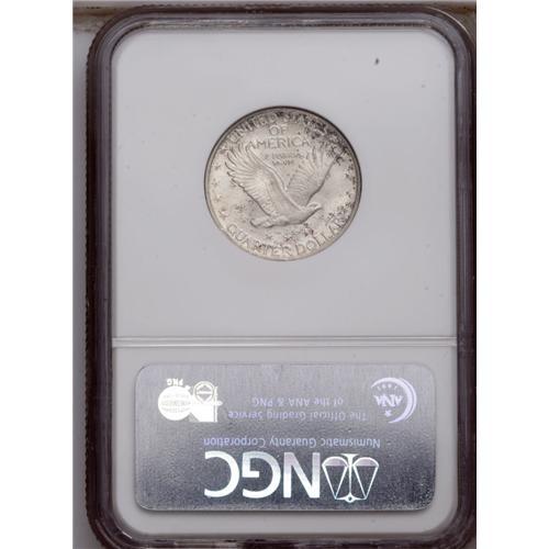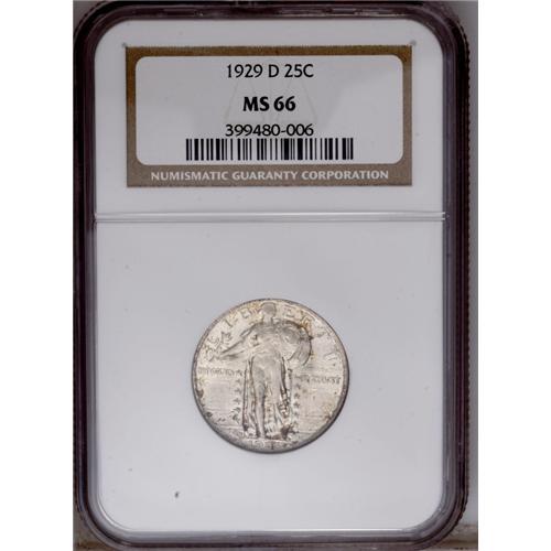 <B>1929-D<25C> MS66 NGC.</B></I> Freckles of golden-brown and russet toning encroach upon the centers of this generally cream-gray Premium Gem. Lustrous and well preserved, but the center of the head is softly defined. A low mintage issue.