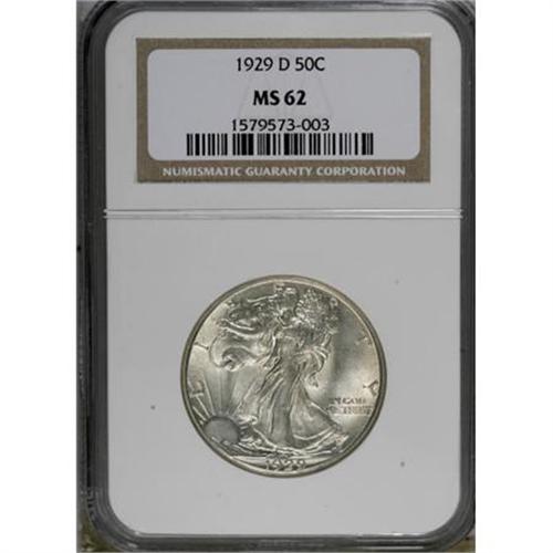 <B>1929-D 50C MS62 NGC.</B></I> . NGC Census: (65/363). PCGS Population (62/719). Mintage: 1,001,200. Numismedia Wsl. Price for NGC/PCGS coin in MS62: $450. (#6589)<BR><BR><B>Coin Engraver:</B> Adolph A. Weinman<BR><BR><b>Shipping:</b> Coins & Currency (<a target="_blank" href="http://www.heritageauctions.com/common/shipping.php">view shipping information</a>)