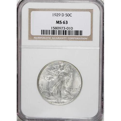 <B>1929-D 50C MS63 NGC.</B></I> NGC Census: (100/258). PCGS Population (181/495). Mintage: 1,001,200. Numismedia Wsl. Price for NGC/PCGS coin in MS63: $540. (#6589)<BR><BR><B>Coin Engraver:</B> Adolph A. Weinman<BR><BR><b>Shipping:</b> Coins & Currency (<a target="_blank" href="http://www.heritageauctions.com/common/shipping.php">view shipping information</a>)