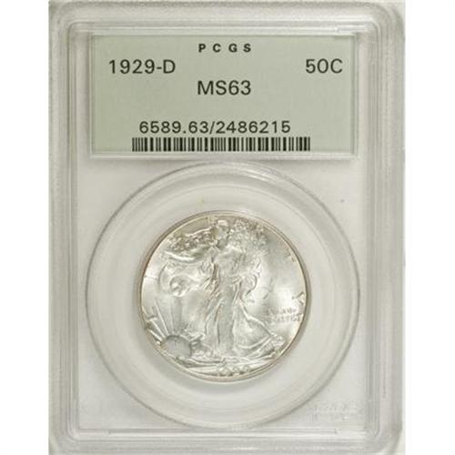 <B>1929-D 50C MS63 PCGS.</B></I> An attractive Select example from the first D-mint Walker half issue struck since 1921. Well-defined with powerful luster and a patch of milky haze in the upper right obverse field, and appealing despite light abrasions on the devices.<BR><BR><b>Shipping:</b> Coins & Currency (<a target="_blank" href="http://www.heritageauctions.com/common/shipping.php">view shipping information</a>)