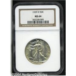 <B>1929-D<50C> MS64 NGC.</B></I> Bright luster radiates through a film of light-gold toning. The central obverse is well struck, showing good, though not full, definition in the left hand and thumb areas, while the eagle's leg feathers are weak. A few scattered, obscure ticks limit the grade. <BR><BR><B>Important notice:</B> Heritage usually auctions material at the rate of 200-250 lots per hour. On some occasions eBay Live bid software or the Internet may not be able to keep up with the pace of the auction. We recommend placing a realistic absentee bid now as insurance to avoid disappointment. Occasionally the auctioneer may eliminate or reject an eBay Live bid, and the auctioneer may also reopen a lot after the close of the eBay live bidding (usually because we missed an audience bid), and may reject your bid even if it shows you as the winning bidder. By bidding via eBay Live, you agree that Heritage may award the lot to another bidder at its sole discretion under the circumstances described above or any other reasonable circumstances. Since eBay bids are not shown to us until we open the lot on the floor, we treat those bids just like floor bids. In most cases the floor responds before the eBay bid is presented to us, due to Internet lag time, so for consistency we have made it a policy that floor bids are always considered first over tie eBay live bids. Also please note that all Heritage lots purchased through eBay Live carry a 20% Buyer's Premium. Please make sure you read the Terms and Conditions before you bid.