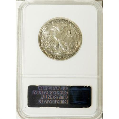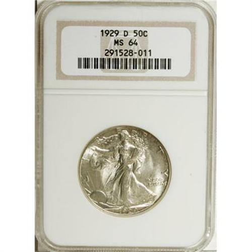 <B>1929-D 50C MS64 NGC.</B></I> Glimpses of chestnut-gold and aqua confirm the originality of this lustrous and relentlessly smooth low mintage near-Gem. A brief dark streak is noted on the upper portion of the front wing.<BR><BR><B>Coin Engraver:</B> Adolph A. Weinman<BR><BR><b>Shipping:</b> Coins & Currency (<a target="_blank" href="http://www.heritageauctions.com/common/shipping.php">view shipping information</a>)