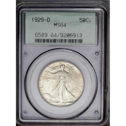 <B>1929-D<50C> MS64 PCGS.</B></I> A shimmering and generally smooth apricot-gray near-Gem. Crisply struck save for the upper skirt lines. Certified in an early generation holder.