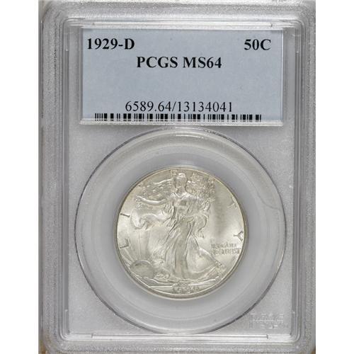 <B>1929-D 50C MS64 PCGS.</B></I> Highly lustrous with frosty silver surfaces and excellent eye appeal, this Choice Mint State piece is sharply struck with nearly full design details including a split thumb.<BR><BR><b>Shipping:</b> Coins & Currency (<a target="_blank" href="http://www.heritageauctions.com/common/shipping.php">view shipping information</a>)