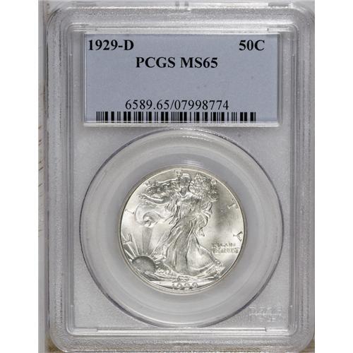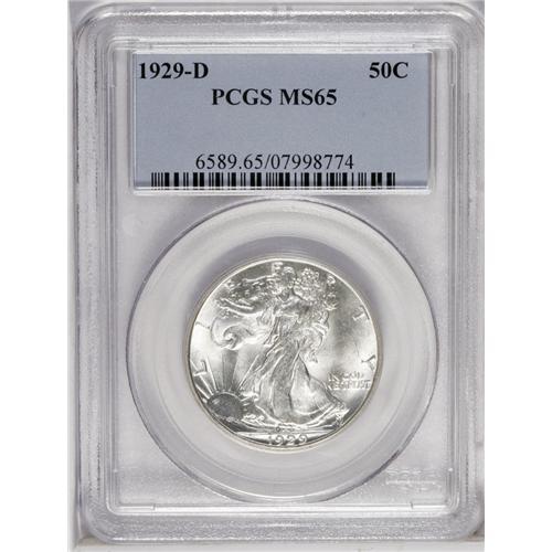 <B>1929-D<50C> MS65 PCGS.</B></I> This exuberant Gem appears more like a 1946-D than a 1929-D in terms of brilliance and freshness. The crisp, unabraded surfaces boast a silver-blue hue, with coruscating luster and enormous eye appeal. The somewhat soft strike through the centers is only a minor detraction. PCGS has graded 48 pieces finer (9/06).