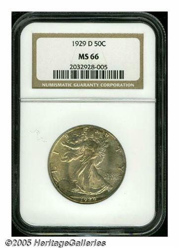 <B>1929-D<50C> MS66 NGC.</B></I> A little more than 1 million 1929-D Half Dollars were originally produced. Despite this limited mintage, the '29-D is among the more readily obtainable branch mint Walkers from the 1920s in Mint State. Bruce Fox (1993) suggests that the Stock Market Crash of that year kept many examples from entering the avenues of commerce. We caution bidders, however, that this issue's dwindling certified population as one progresses up the grading scale confirms the condition rarity of this premium quality Gem. The overall sharp strike is free of criticism, as are the richly frosted and virtually abrasion-free surfaces. Delicate golden iridescence on both sides rounds out this coin's list of positive attributes. Population: 12 in 66, none finer (5/05).<BR><I>From The Clifford Columbus Collection.</B></I>