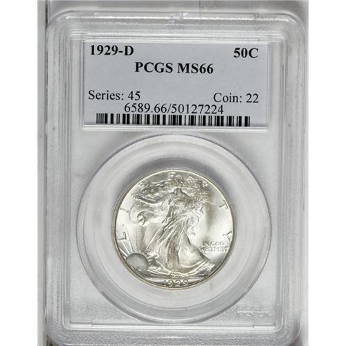 <B>1929-D<50C> MS66 PCGS.</B></I> A satiny Premium Gem, blanketed in white luster broken only by one or two hints of tan color in the centers. The obvious eye appeal is enhanced by a full strike, and Liberty's head is particularly well-defined. Surface markings are minor, with none worthy of individual notice. The 1929-D is scarce in MS66 and virtually unheard of any nicer, as the major grading services have combined to assign only one piece an MS67 grade to date (8/06). Unquestionably a coin destined for an outstanding registry set.<BR><I>From The Big Tex Registry Set of Walking Liberty Halves.</B></I>