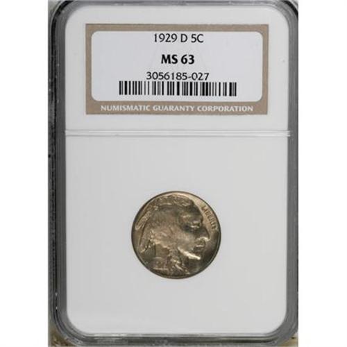 <B>1929-D 5C MS63 NGC.</B></I> NGC Census: (143/365). PCGS Population (249/652). Mintage: 8,370,000. Numismedia Wsl. Price for NGC/PCGS coin in MS63: $94. (#3967)<BR><BR><B>Coin Engraver:</B> James E. Fraser<BR><BR><b>Shipping:</b> Coins & Currency (<a target="_blank" href="http://www.heritageauctions.com/common/shipping.php">view shipping information</a>)