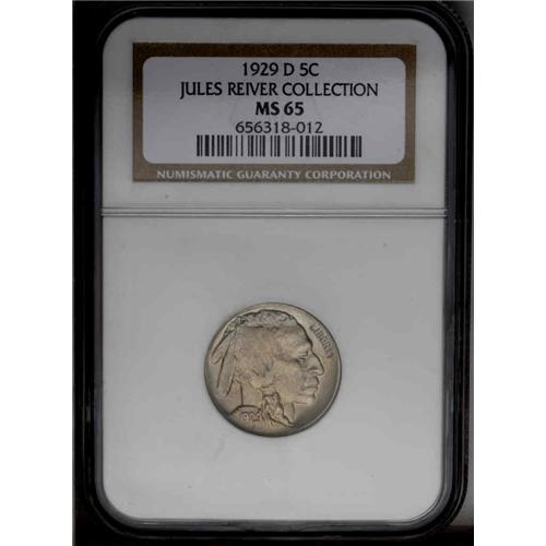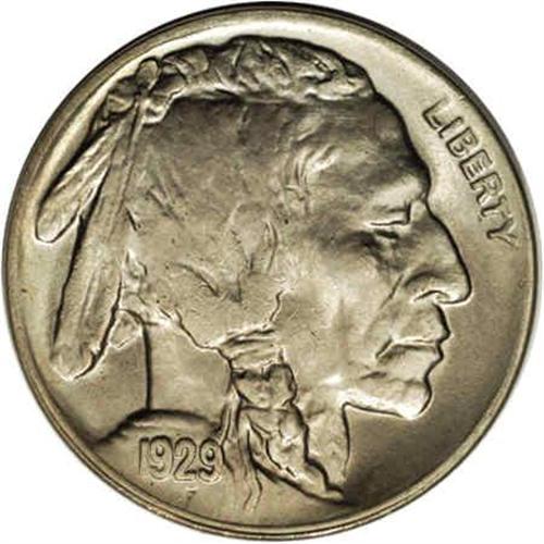 <B>1929-D<5C> MS65 NGC.</B></I> Apricot and sky-blue colors invigorate this splendidly preserved Gem. The centers show the weakness characteristic of the issue, while the bison's head and tail are crisp. A common date in worn condition, but few remain in lofty Mint State grades.