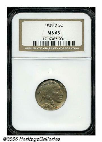 <B>1929-D<5C> MS65 NGC.</B></I> Nicely struck, with gold, crimson, violet, and green iridescence. Generally nicely struck, save for portions of the Indian's hair and the bison's left leg. A couple of tiny marks are noted on the Indian's cheek. Population: 53 in 65, 11 finer (3/05).