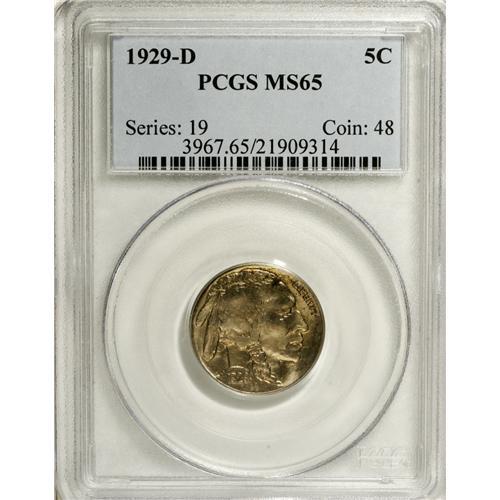 <B>1929-D 5C MS65 PCGS.</B></I> Lustrous, nicely preserved surfaces exhibit a thin veneer of gold-champagne color. Sharply struck on the design elements.<BR><BR><b>Shipping:</b> Coin/Currency (<a target="_blank" href="http://www.heritageauctions.com/common/shipping.php">view shipping information</a>)