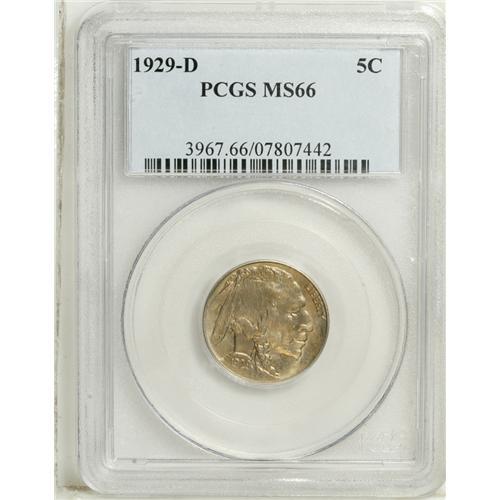 <B>1929-D 5C MS65 PCGS.</B></I> Variegated ice-blue, gold, and lavender patina bathes highly lustrous surfaces. Well preserved and nicely struck, except for the usual softness on the bison's head.<BR><BR><b>Shipping:</b> Coin/Currency (<a target="_blank" href="http://www.heritageauctions.com/common/shipping.php">view shipping information</a>)