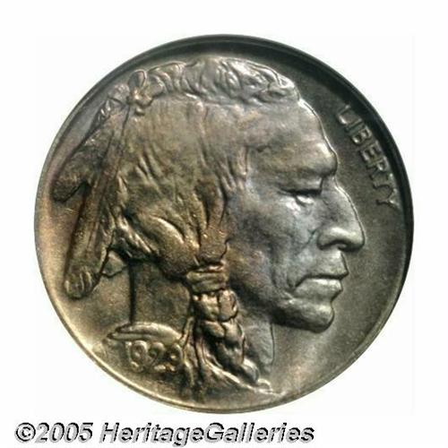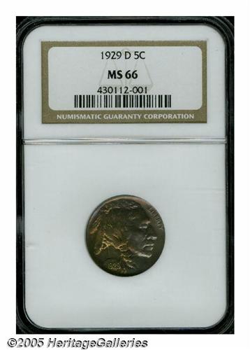 <B>1929-D<5C> MS66 NGC.</B></I> One of the more readily available D-mint Buffaloes from the 1920s, the '29-D was the Denver Mint's last contribution to the five cent denomination until 1934. Well struck overall, with just a touch of weakness on the reverse, lovely golden-orange, steel-blue, and lilac toning on display, over both sides of the coin, and beautifully preserved, essentially pristine surfaces. An affordable type coin, or a suitable representative for an advanced Buffalo nickel collection. Population: 11 in 66, 0 finer (3/05).