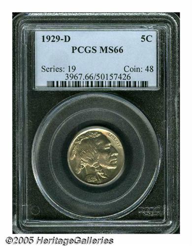 <B>1929-D<5C> MS66 PCGS.</B></I> Although the 1929-D was a comparatively high mintage issue by the standards of the Denver Mint, it is one that is seldom located in high grades. This is a satiny example that is nearly abrasion-free with light apricot and steel-blue toning over each side. Well defined in all the important areas. Population: 37 in 66, 1 finer (6/05).