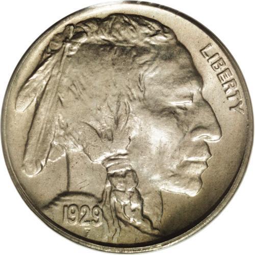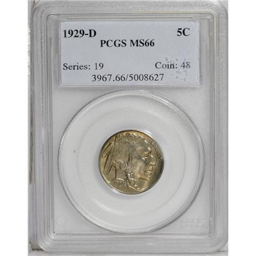<B>1929-D<5C> MS66 PCGS.</B></I> This high grade example shows an uncommonly strong strike on each side with the separation in the Indian's hair almost complete down to the knot in the braid. Bright mint luster glows on each side and the well preserved surfaces show light lilac patina in the centers with golden-brown widely dispersed around the margins. Nearly unobtainable any finer. Population: 46 in 66, 1 finer (6/06).