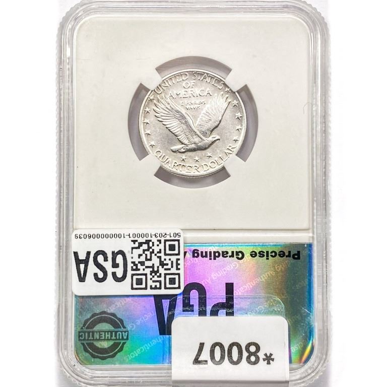 COINS AND CURRENCY LISTED IN GSA’S CATALOG AS GRADED AND ENCAPSULATED BY PCGS, NGC, ANACS, ICG, PCGS CURRENCY, PMG, PCGS BANKNOTE GRADING, CMC OR ANY OTHER THIRD-PARTY GRADING SERVICE ARE LIKEWISE SOLD “AS-IS” EXCEPT AS EXPRESSLY SET FORTH HEREIN. ALL THIRD-PARTY GRADING SERVICE GUARANTEES, INCLUDING AUTHENTICITY, ARE THE SOLE RESPONSIBILITY OF THE THIRD-PARTY GRADING SERVICE AND NOT WARRANTIES OR GUARANTEES OF GSA. BIDDERS SHOULD CONTACT THESE THIRD-PARTY GRADING SERVICES DIRECTLY WITH RESPECT TO ANY CLAIMS OR QUESTIONS THEY MAY HAVE CONCERNING THEIR GUARANTEES AND WARRANTIES. BIDDERS ACKNOWLEDGE AND AGREE THAT AUCTIONEER IS NOT BOUND BY OR LIABLE FOR ANY OPINION OR CERTIFICATION BY ANY THIRD-PARTY GRADING SERVICE. REMOVAL OF A PRODUCT FROM ITS PROTECTIVE CASING OR HOLDER OR ALTERATION OF ANY COIN HOLDER WAIVES ALL RIGHTS CONCERNING THE PRODUCT CONTAINED THEREIN.